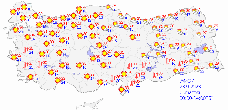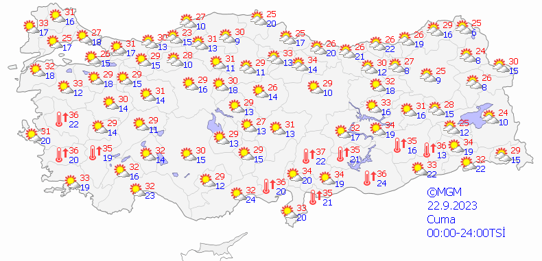 Meteoroloji Genel Müdürlüğü tarafından yapılan son değerlendirmelere göre: Ülkemizin kuzey ve doğu kesimlerinin parçalı yer yer çok bulutlu, öğleden sonra Doğu Akdeniz Toroslar Mevkii, Osmaniye, İskenderun Körfezi, Doğu Karadeniz'in iç kesimleri ile Erzurum, Kars ve Ardahan çevreleri ile Iğdır'ın güney, Sivas, Ağrı ve Van'ın doğu ilçelerinin yerel sağanak ve gök gürültülü sağanak yağışlı, diğer yerlerin az bulutlu ve açık geçeceği tahmin ediliyor.