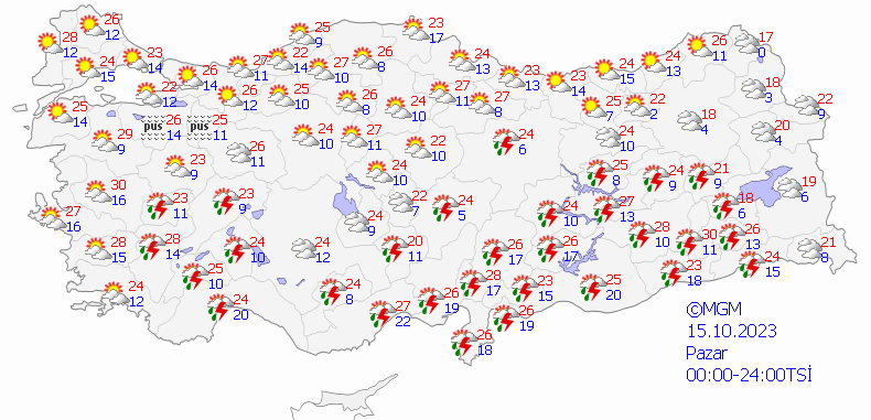 Meteoroloji Genel Müdürlüğü tarafından yapılan son değerlendirmelere göre: Ülkemizin kuzey ve doğu kesimleri ile zamanla Akdeniz'in parçalı, yer yer çok bulutlu, öğle saatlerinden sonra Antalya'nın batısının iç kesimleri, Denizli, Burdur ve Van'ın güney, Muğla ve Bitlis'in doğu kesimlerinin yerel olmak üzere sağanak ve yer yer gök gürültülü sağanak yağışlı, diğer yerlerin az bulutlu ve açık geçeceği tahmin ediliyor. Sabah ve gece saatlerinde Marmara'nın güneyi, İç Ege, İç Anadolu'nun kuzeydoğu kesimleri ve Batı Karadeniz'in iç kesimlerinde pus ve yer yer sis bekleniyor.