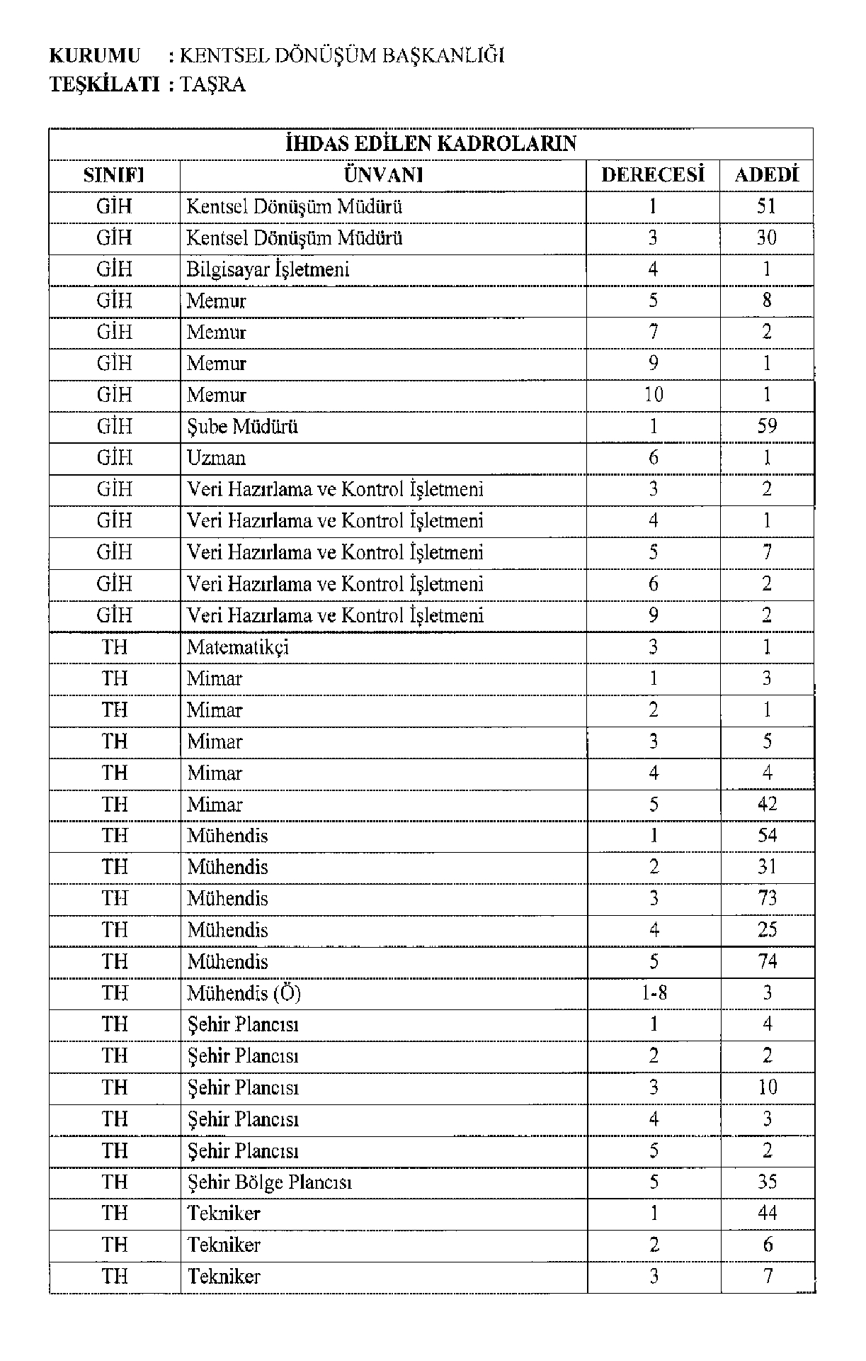 MADDE 8- 3 sayılı Üst Kademe Kamu Yöneticileri ile Kamu Kurum ve Kuruluşlarında Atama Usüllerine Dair Cumhurbaşkanlığı Kararnamesinin eki (I) sayılı Cetvele "KENTSEL DÖNÜŞÜM BAŞKANI" ve "KENTSEL. DÖNÜŞÜM BAŞKAN YARDIMCILARI" satırları eklenmiştir.