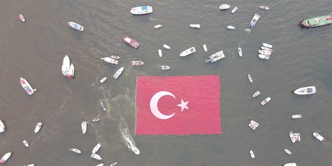 Sekapark'a getirilen dev bayrak, dalgıçlar tarafından denizde açıldı. Çok sayıda tekne, kıyıda da binlerce vatandaş, bu ana tanıklık etti.