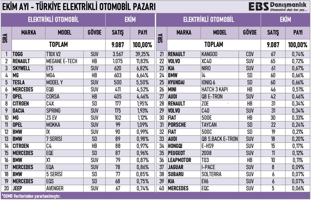 Türkiye'de ekim ayında toplam 9 bin 89 elektrikli otomobil satıldı. Listenin zirvesinde 3 bin 567 satış adediyle Togg'un SUV modeli T10X V2 yer aldı. Böylece ekim ayında Togg'un elektrikli otomobil satışındaki payı yüzde 39.25 oldu.