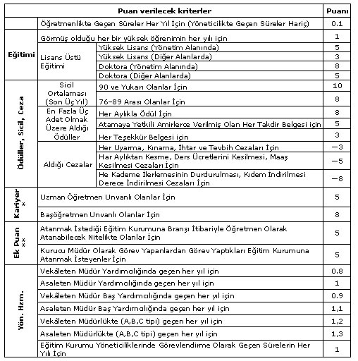 (**) Meslek liseleri ve mesleki teknik ortaöğretim kurumu yöneticiliklerine atanacaklar bakımından atölye, laboratuar veya meslek dersleri öğretmeni olanlara değerlendirme sonucu çıkan toplam puanın %10'u ayrıca ek puan olarak verilir.