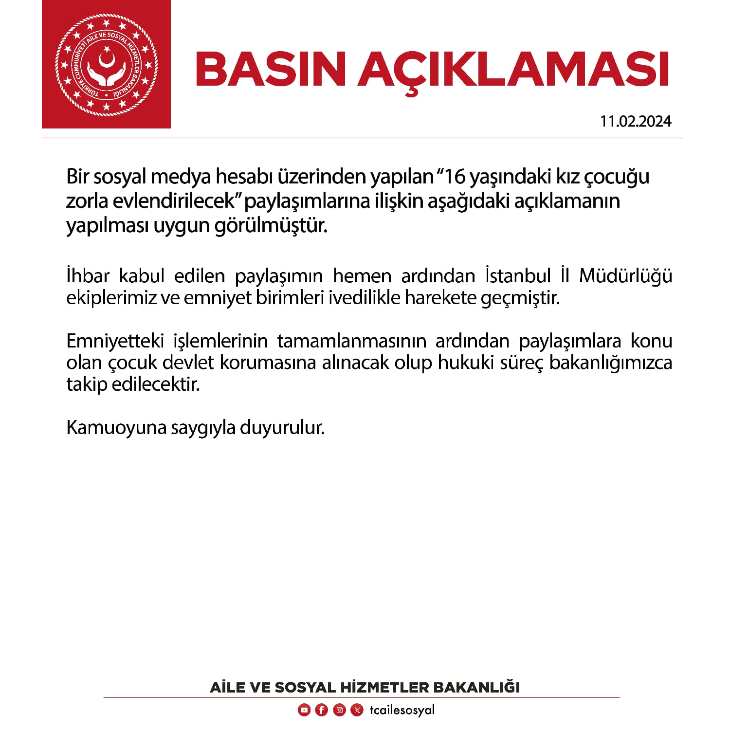 Aile ve Sosyal Hizmetler Bakanlığı'nca yapılan yazılı açıklamada, "Bir sosyal medya hesabı üzerinden yapılan '16 yaşındaki kız çocuğu zorla evlendirilecek' paylaşımlarına ilişkin aşağıdaki açıklamanın yapılması uygun görülmüştür. İhbar kabul edilen paylaşımın hemen ardından İstanbul İl Müdürlüğü ekiplerimiz ve emniyet birimleri ivedilikle harekete geçmiştir. Emniyetteki işlemlerinin tamamlanmasının ardından paylaşımlara konu olan çocuk devlet korumasına alınacak olup hukuki süreç bakanlığımızca takip edilecektir" ifadelerine yer verildi.
