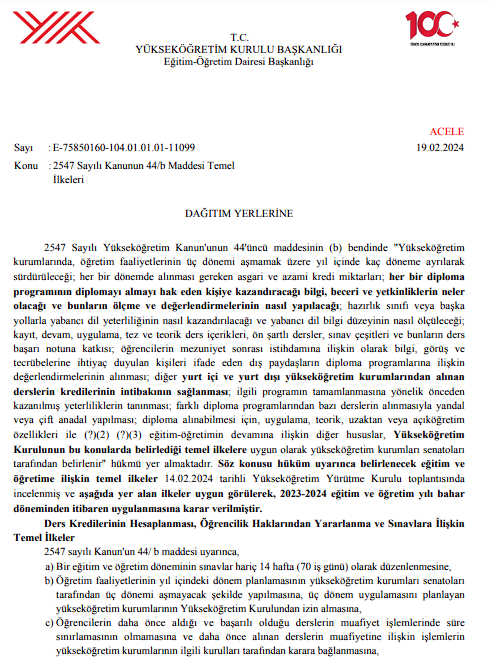 Yükseköğretim Kurulu yazısında belirlenen ilkelerin 2023-2024 akademik yılından