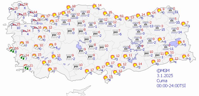 Meteoroloji Genel Müdürlüğü tarafından yapılan son tahminlere göre: Ege kıyılarının parçalı ve çok bulutlu, gece saatlerinden itibaren İzmir, Aydın ve Muğla çevrelerinin hafif sağanak yağışlı, diğer yerlerin az bulutlu ve açık geçeceği tahmin ediliyor. Ülkemizin iç ve doğu kesimlerinde buzlanma ve don ile birlikte pus ve sis bekleniyor. Doğu Karadeniz'in iç kesimlerinin yüksekleri ile Doğu Anadolu'nun doğusunun yüksek ve dik yamaçlarında çığ tehlikesi bulunmaktadır. İşte 2 Ocak 2025 Perşembe gününe ilişkin bölge bölge hava durumu tahminleri...