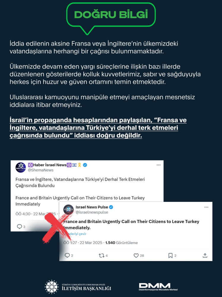 Türkiye Cumhuriyeti Cumhurbaşkanlığı İletişim Başkanlığı Dezenformasyonla Mücadele Merkezi (DMM), sosyal medyada yayılan "Fransa ve İngiltere'nin vatandaşlarına Türkiye'yi derhal terk etmeleri çağrısında bulunduğu" yönündeki iddiaların asılsız olduğunu açıkladı. Bu tür dezenformasyonlar, genellikle uluslararası kamuoyunu yanıltma amacı taşımaktadır.