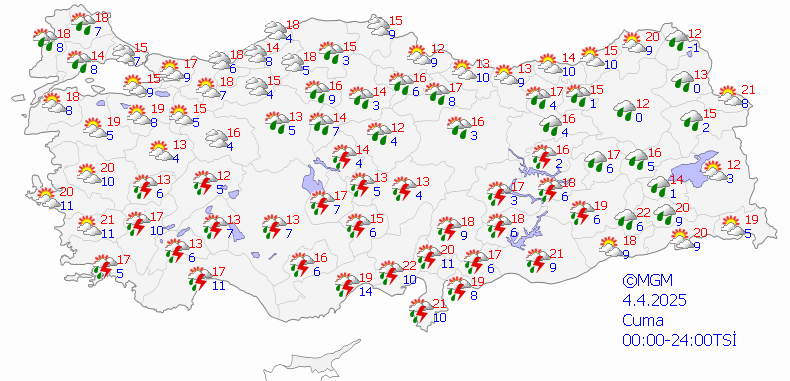 - Afyonkarahisar: 12°C, parçalı ve çok bulutlu, aralıklı yağmur ve sağanak, yer yer gök gürültülü sağanak bekleniyor.