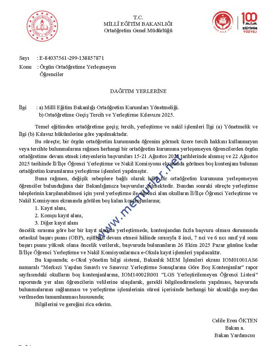 Milli Eğitim Bakanlığı, 26.08.2025 tarih ve 138857871 sayılı yazısıyla örgün ortaöğretime yerleşmeyen öğrenciler için uygulanacak işlemleri açıkladı. İşlemler, Ortaöğretim Kurumları Yönetmeliği ve 2025 Ortaöğretime Geçiş Tercih ve Yerleştirme Kılavuzu hükümlerine göre yürütülecek.