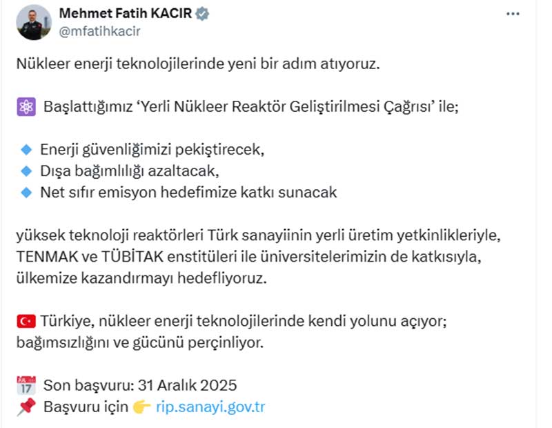Sanayi ve Teknoloji Bakanı Mehmet Fatih Kacır, kişisel sosyal medya hesabından yaptığı açıklamada, çağrının enerji üretimi yönüne vurgu yaparak, "Başlattığımız 'Yerli Nükleer Reaktör Geliştirilmesi Çağrısı' ile; enerji güvenliğimizi pekiştirecek, dışa bağımlılığı azaltacak, net sıfır emisyon hedefimize katkı sunacak yüksek teknoloji reaktörleri Türk sanayiinin yerli üretim yetkinlikleriyle, TENMAK ve TÜBİTAK enstitüleri ile üniversitelerimizin de katkısıyla, ülkemize kazandırmayı hedefliyoruz. Türkiye, nükleer enerji teknolojilerinde kendi yolunu açıyor; bağımsızlığını ve gücünü perçinliyor" İfadesine yer verdi.