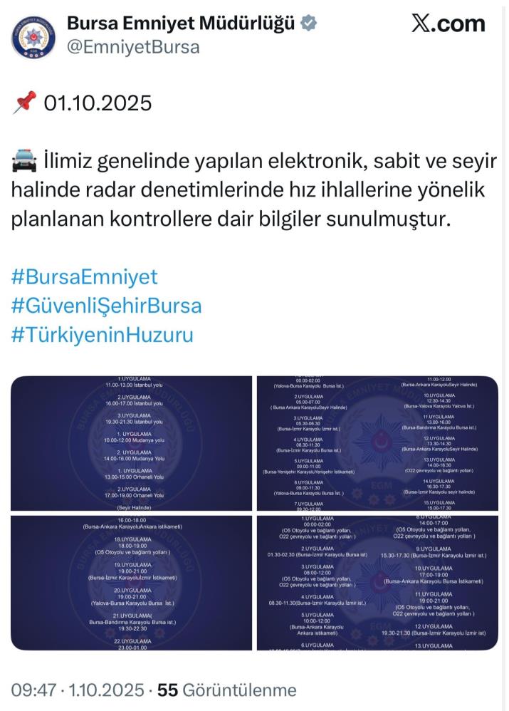 Bursa polisi, kentteki hız denetimleri ile ilgili yeni bir karar aldı. Buna göre kent genelinde yapılan elektronik, sabit ve seyir halindeki radar denetimlerinin yerleri sosyal medyada paylaşılacak.