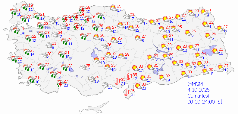 Meteoroloji Genel Müdürlüğü, 2 Ekim Çarşamba gününe ilişkin hava durumu raporunu yayımladı. Türkiye'nin kuzey ve doğu kesimlerinde parçalı ve çok bulutlu hava hakim olurken, bazı bölgelerde sağanak yağış bekleniyor.