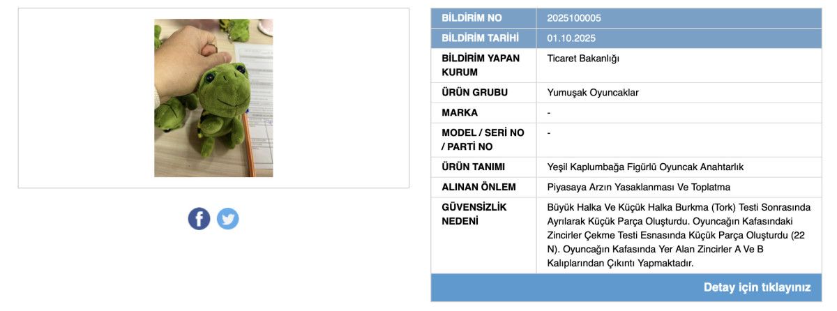 Yapılan açıklamada, söz konusu ürünlerin "yumuşak oyuncaklar" kategorisinde olduğu ve ciddi boğulma riski taşıdığı belirtildi.