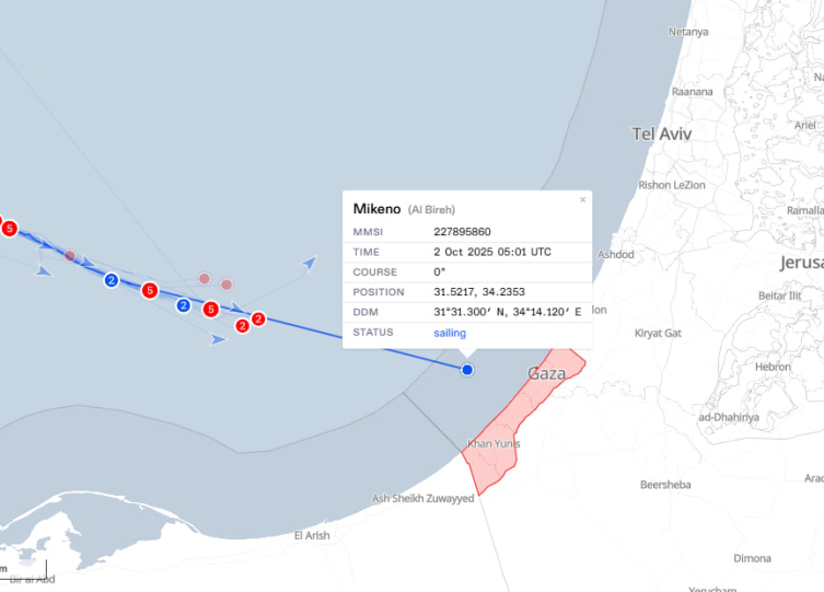 "Mikeno" adlı bir teknenin Gazze'nin kara sularında bulunduğunu gösteriyor. Ancak geminin İsrail güçlerince durdurulup durdurulmadığı henüz belirsiz.