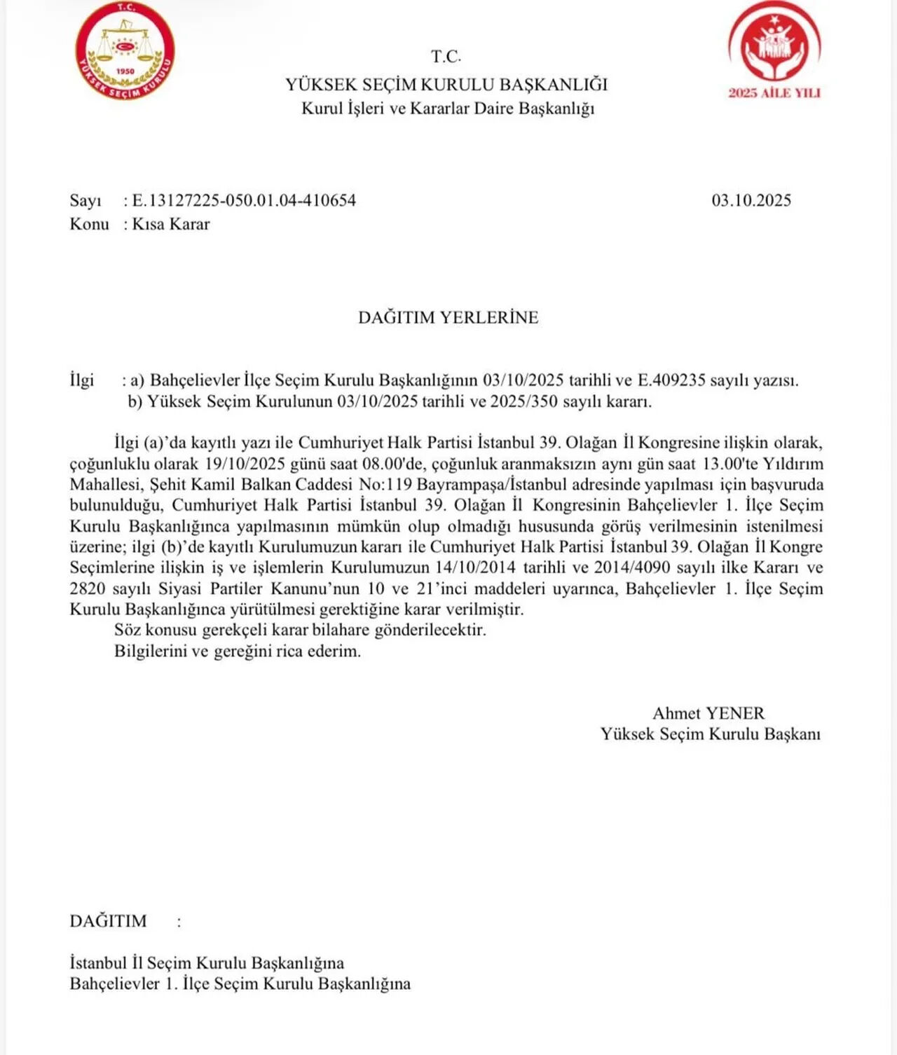 YSK'nın 03 Ekim 2025 tarihli ve 2025/350 sayılı kısa kararında, CHP'nin İstanbul İl Kongresi'nin yapma başvurusu onaylandı.
