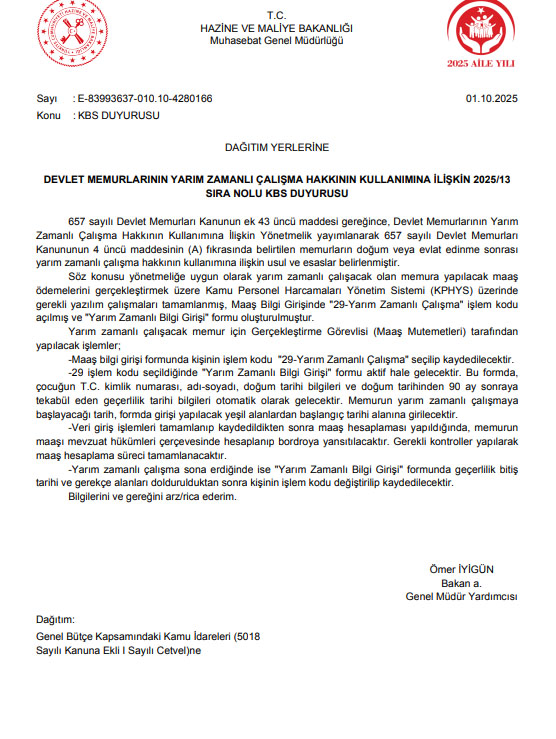 Hazine ve Maliye Bakanlığı, kamu kurumlarında yarım zamanlı çalışma hakkını kullanan personelle ilgili maaş işlemlerine dair yeni bir duyuru yayımladı.