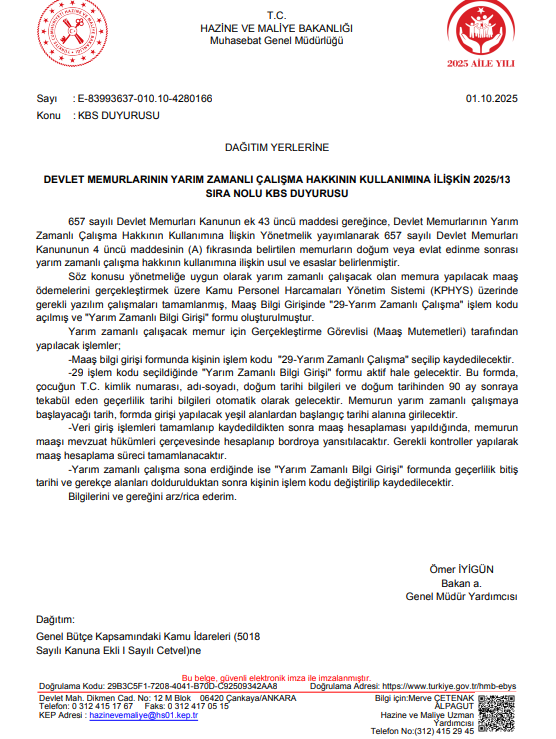 Bakanlık tarafından yapılan açıklamada, yarım zamanlı çalışan kamu görevlilerinin maaş, sosyal hak ve kesintilerinin nasıl uygulanacağı konusunda tereddütlerin giderilmesi amacıyla tüm kamu idarelerine bilgilendirme yapıldığı belirtildi.