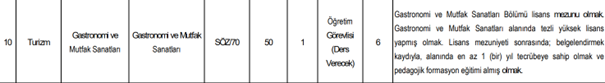 Söz konusu kadrolar içerisinde yer alan; Turizm Fakültesi Gastronomi ve Mutfak Sanatları Bölümü Gastronomi ve Mutfak Sanatları Anabilim Dalı Öğretim Görevlisi ilanında; "Gastronomi ve Mutfak Sanatları Bölümü lisans mezunu olmak. Gastronomi ve Mutfak Sanatları alanında tezli yüksek lisans yapmış olmak. Lisans mezuniyeti sonrasında; belgelendirmek kaydıyla, alanında en az 1 (bir) yıl tecrübeye sahip olmak ve pedagojik formasyon eğitimi almış olmak." şartı aranmaktadır.