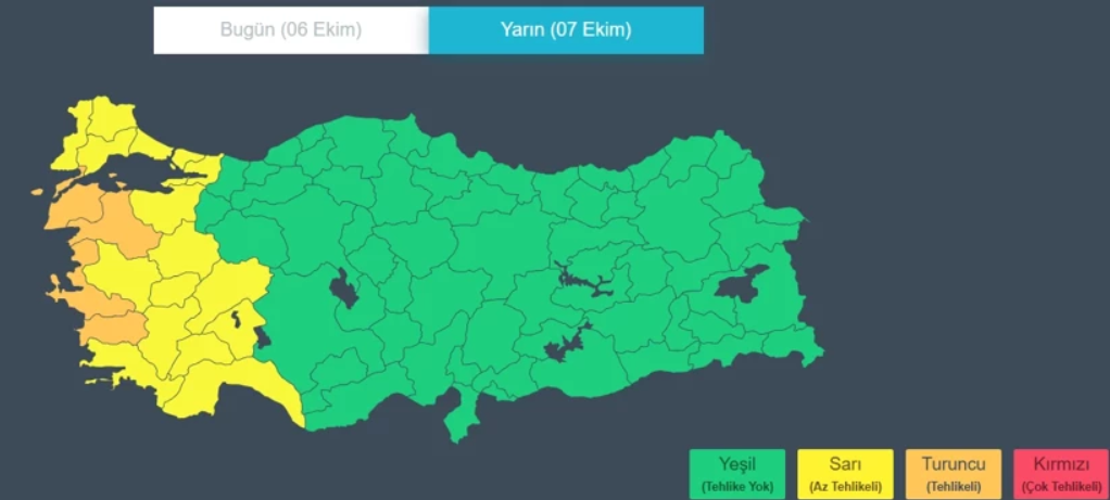 Meteoroloji, hava koşulları nedeniyle toplam 20 il için uyarı kodları yayımladı. Yağışların şiddetinin en yüksek beklendiği Aydın, Balıkesir, Çanakkale ve İzmir için 'turuncu' kodlu alarm verildi.
