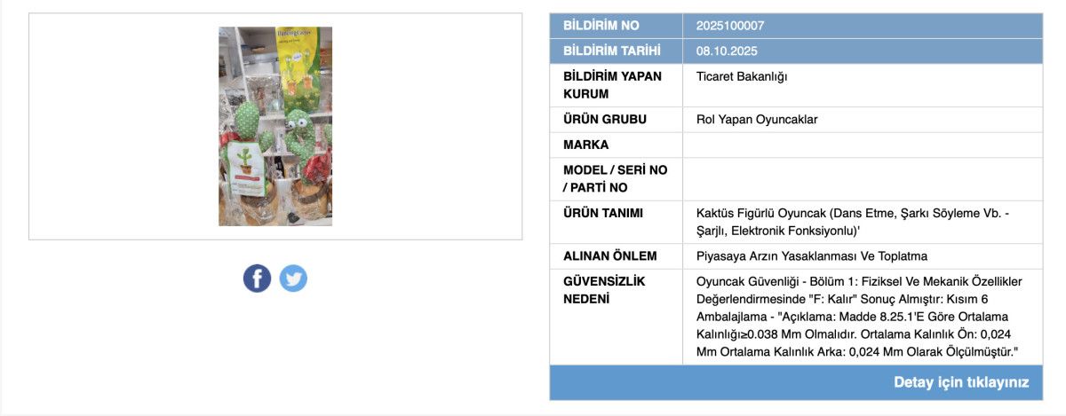 Bir dönem sosyal medyada büyük ilgi gören ve birçok evde çocukların neşeyle oynadığı "Dans Eden Kaktüs" oyuncağı, güvenlik riski nedeniyle artık piyasadan toplatılıyor.