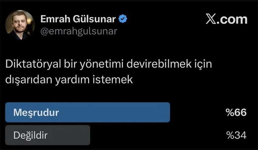 Geçtiğimiz günlerde X platformunda, "Diktatöryal bir yönetimi devirebilmek için dışarıdan yardım istemek" başlığıyla bir darbe anketi yapan Gülsunar'a, sosyal medyadan tepki yağdı.