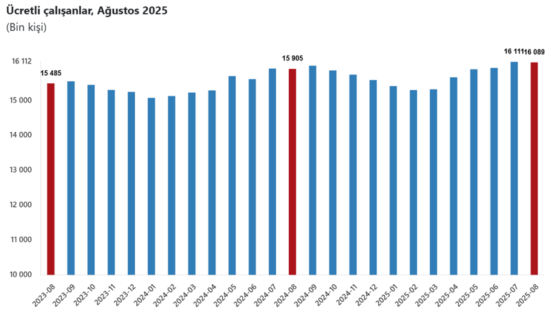 Ücretli çalışan sayısı bir önceki yılın aynı ayında 15 milyon 904 bin 602 kişi iken, 2025 yılı Ağustos ayında 16 milyon 89 bin 450 kişi oldu.