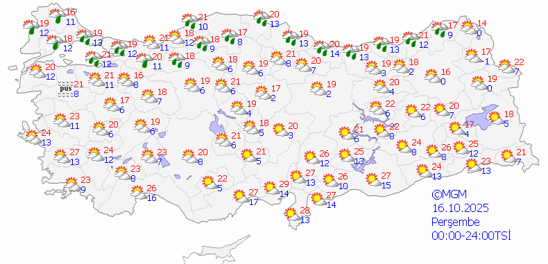 - İstanbul: 19°C, parçalı, yer yer çok bulutlu, aralıklı sağanak yağışlı.