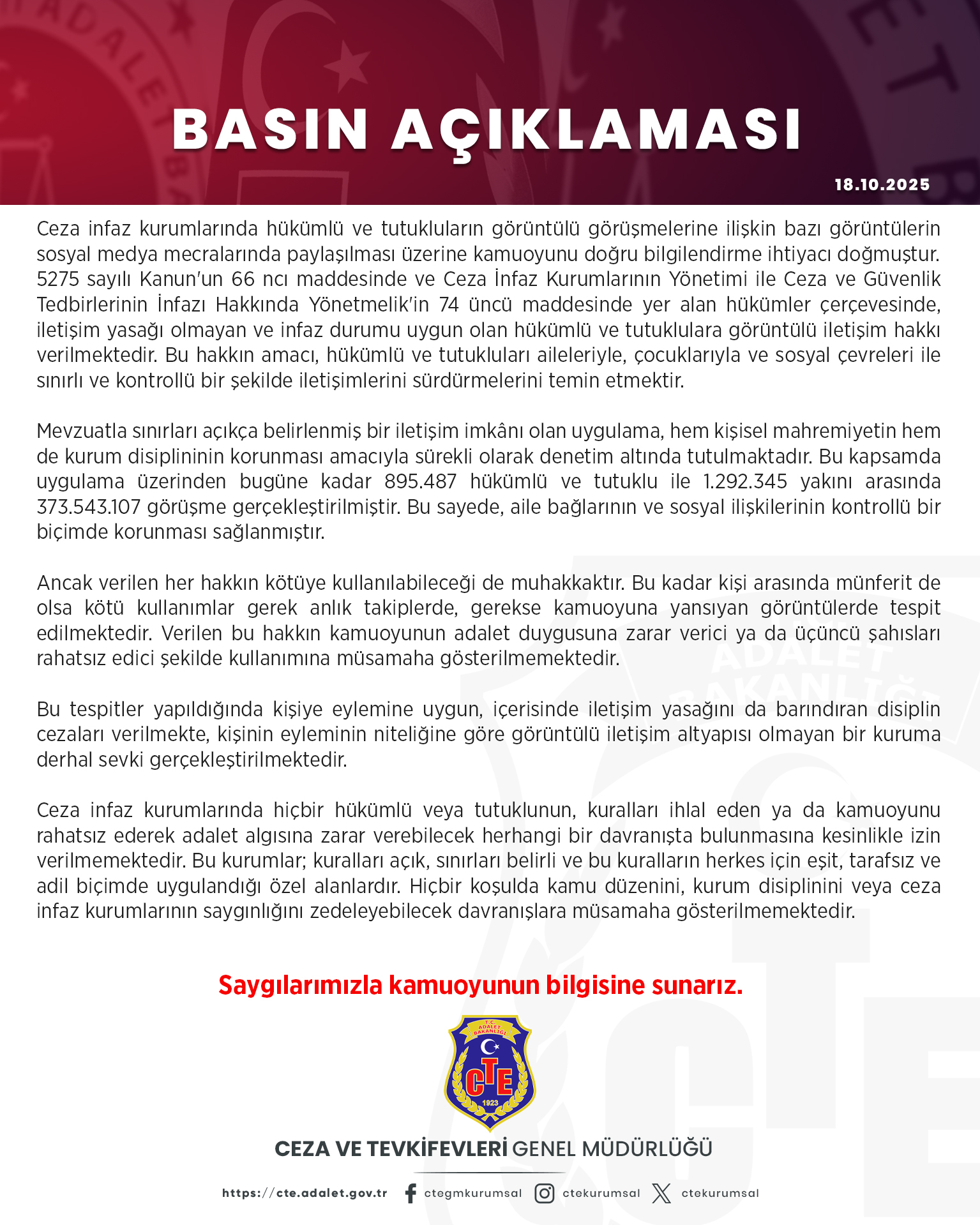 Ceza İnfaz Kurumları ve Tevkifevleri Genel Müdürlüğü (CTE), hükümlü ve tutukluların aileleriyle gerçekleştirdiği görüntülü görüşmelerin sosyal medyada izinsiz paylaşılması ve kamuoyunda infiale yol açması üzerine yazılı bir basın açıklaması yayınladı.