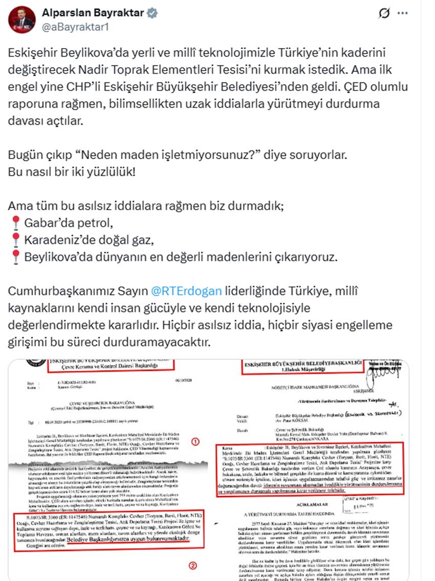 Enerji ve Tabii Kaynaklar Bakanı Alparslan Bayraktar, Eskişehir Beylikova'da kurulması planlanan Nadir Toprak Elementleri Tesisi için bugünlerde eleştiri getiren CHP'nin gündeme getirdiği "Neden madeni işletmiyorsunuz" sorusuna, projedeki ÇED raporuna ilk dava açanın CHP'li Eskişehir Belediyesi olduğuna dikkat çekerek yanıt verdi.