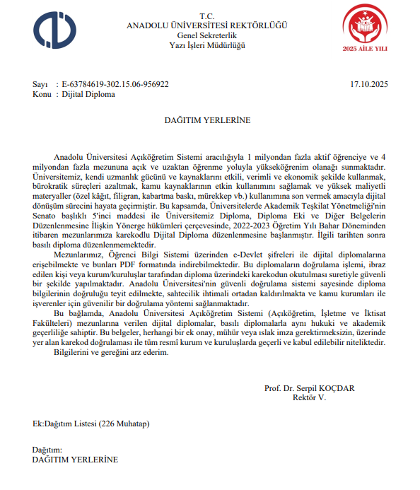Anadolu Üniversitesi tarafından tüm kamu idarelerine gönderilen yazıya göre, dijital diploma dönemine geçiş yapıldığı ilan edildi.