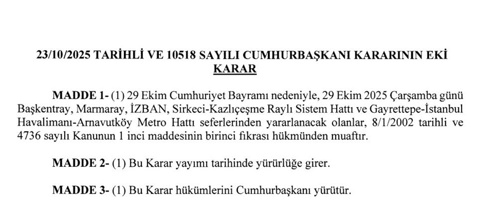 Cumhurbaşkanı Recep Tayyip Erdoğan'ın imzası ile yayımlanan karara göre, 29 Ekim Cumhuriyet Bayramı nedeniyle 29 Ekim Çarşamba günü Başkentray, Marmaray, İZBAN, Sirkeci-Kazlıçeşme Raylı Sistem Hattı ve Gayrettepe-İstanbul Havalimanı-Arnavutköy Metro Hattı seferleri ücretsiz olacak.