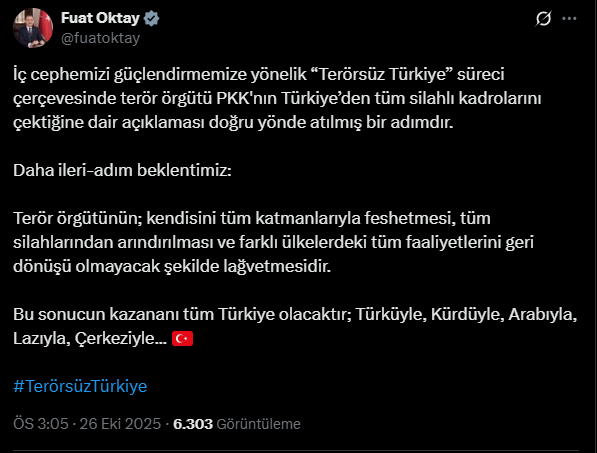 Sosyal medya hesabından (X) bir açıklama yapan Oktay, çekilme kararının "iç cephemizi güçlendirmeye yönelik doğru yönde atılmış bir adım" olduğunu belirtti. Ancak Oktay, bu gelişmenin nihai çözüm için yeterli olmadığını net bir şekilde vurgulayarak asıl beklentilerini dile getirdi: "Daha ileri-adım beklentimiz var."