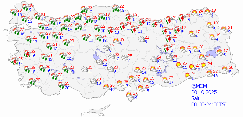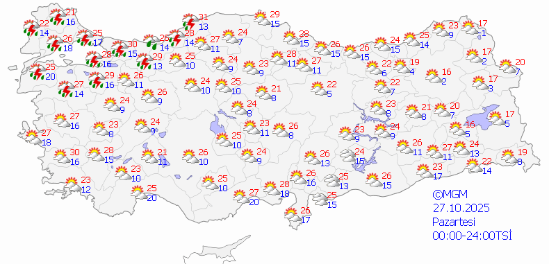İstanbul'da bugün ve yarın gök gürültülü kuvvetli sağanak var, çarşamba az bulutlu. Ankara ve İzmir'de ise bugün hava parçalı bulutlu olacak. Yarın her iki şehirde de gök gürültülü sağanak bekleniyor. En yüksek sıcaklık İzmir'de 26, İstanbul'da 25, Ankara'da 24 derece.