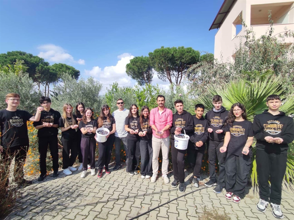 Milli Eğitim Bakanlığı'nın 2025-2026 eğitim öğretim yılı için başlattığı 'Yeşil Vatan-Benim Okulum Geleceğe Çare' kampanyası, İzmir Bergama'da Cumhuriyet Anadolu Lisesi'nde uygulamalı çevre ve sürdürülebilirlik projesiyle hayat buldu. Lise öğrencileri ve öğretmenler, 5 yıl önce okul bahçesine dikilen zeytin ağaçlarının hasadını gerçekleştirdi. Öğrenciler, topladıkları zeytinleri kışın kahvaltılarında tüketmek için kurdu.