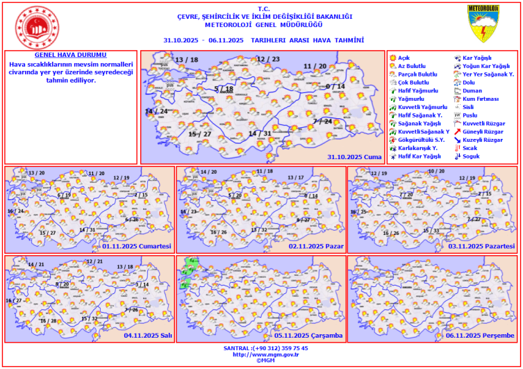 Önümüzdeki bir haftalık süreçte günün en yüksek sıcaklık değerleri Ankara'da 20, İstanbul'da 21, İzmir'de 27, Antalya'da 28, Adana'da 32, Diyarbakır'da 26, Samsun'da 21 derceye kadar yükselecek.