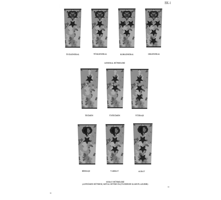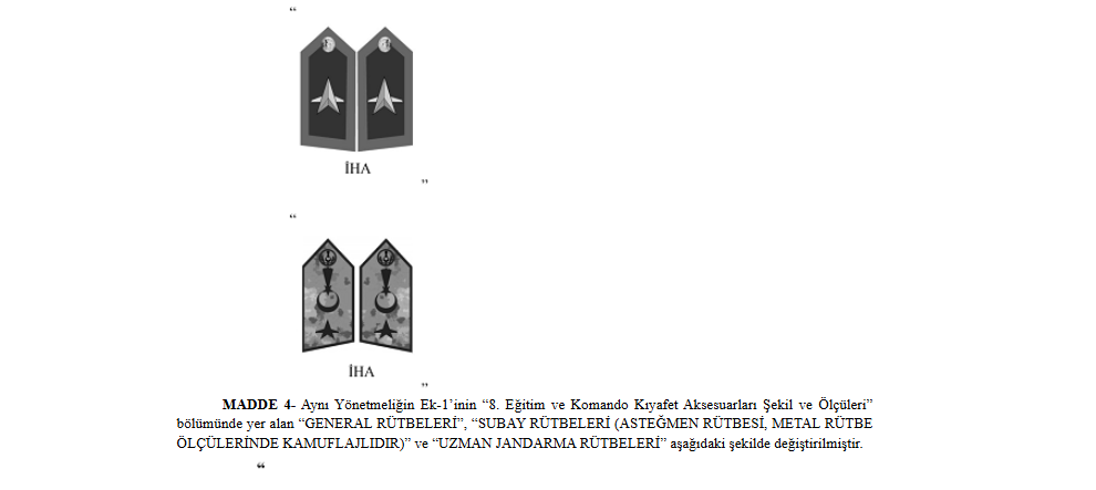 MADDE 3- Aynı Yönetmeliğin EK-1'inin 4. 1 Numaralı Üniforma, Tören ve Günlük Çalışma Kıyafet Aksesuarları Şekil ve Ölçüleri başlıklı bölümünün SUBAY, ASTSUBAY, UZMAN JANDARMA VE UZMAN ERBAŞ BRANŞ YAKA İŞARETLERİ'ne HUKUK yaka işaretinden sonra gelmek üzere aşağıdaki yaka işareti eklenmiş ve 8. Eğitim ve Komando Kıyafet Aksesuarları Şekil ve Ölçüleri başlıklı bölümünün SUBAY, ASTSUBAY, UZMAN JANDARMA VE UZMAN ERBAŞ YAKA İŞARETLERİ VE ÖLÇÜLERİ'ne HUKUK yaka işaretinden sonra gelmek üzere aşağıdaki yaka işareti eklenmiştir.