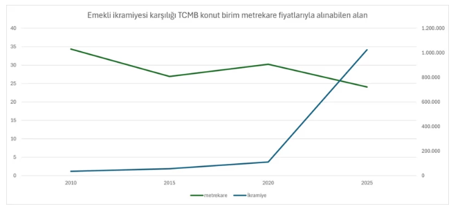 2010 yılında 35 bin 786 TL seviyesinde olan emekli ikramiyesiyle 34 metrekare bir ev alınabilirken, 2025 yılında bu oran 24 metrekareye düştü.