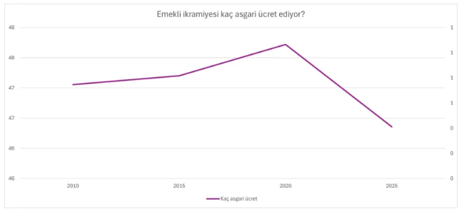 2010 yılında 25 yıllık bir öğretmenin emekli ikramiyesi, 760,5 TL karşılığında 47 asgari ücret ederken, 2025 yılında 22.104 TL olan asgari ücretle 46 asgari ücrete geriliyor.