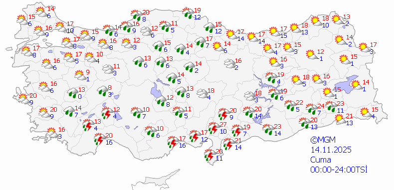 Meteoroloji Genel Müdürlüğü'nün tahminlerine göre, Türkiye genelinde parçalı ve yer yer çok bulutlu bir hava bekleniyor. Yağışlar, Marmara, Ege, Doğu Akdeniz, Antalya ve İç Anadolu'nun bazı bölgeleri (Eskişehir, Kayseri, Sivas, Niğde) dahil olmak üzere geniş bir alanda sağanak ve gök gürültülü sağanak şeklinde görülecek. Mevsim normalleri üzerinde seyreden hava sıcaklıklarının ise yağışlı hava ile birlikte kuzeybatı kesimlerden başlayarak azalacağı ve mevsim normalleri civarına düşeceği tahmin ediliyor.