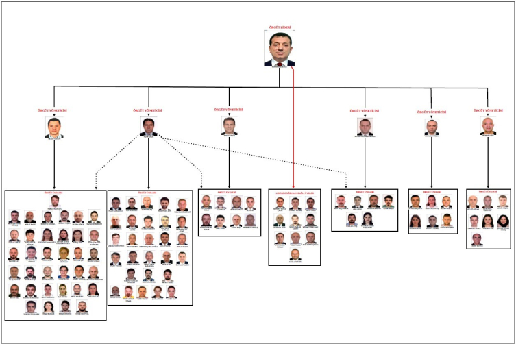 Şemada Ekrem İmamoğlu'na doğrudan bağlı 10 örgüt üyesinin olduğu, 77 örgüt üyesinin Fatih Keleş'e, 35'inin Murat Ongun'a, 8'inin Ertan Yılmaz'a, 7'sinin Hüseyin Gün'e, 6'sının Murat Gülibrahimoğlu'na ve 6'sının Adem Soytekin'e bağlı olduğu gösterildi.