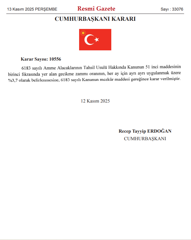 Cumhurbaşkanı Recep Tayyip Erdoğan'ın imzasıyla yayımlanan Resmi Gazete kararına göre, kamu alacaklarının tahsilinde uygulanan gecikme zammı oranı düşürüldü. 6183 sayılı Amme Alacaklarının Tahsil Usulü Hakkında Kanun'un ilgili maddesine göre, aylık gecikme zammı oranı %4,5'tan %3,7'ye indirildi. Karar, kamuya olan borçlarını gecikmeli ödeyen mükellefler için finansal bir rahatlama getirmeyi hedefliyor.