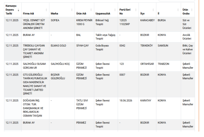 Tarım ve Orman Bakanlığı, 12 Kasım 2025 tarihli taklit ve tağşişli ürünler listesini kamuoyuyla paylaştı. Listede, Samsun Tekkeköy'de üretilen "Elmas Gold" markalı siyah çayda gıda boyası kullanıldığı tespit edildi. Ayrıca, Bursa Karacabey'de üretilen "SOFIEA" markalı 1000 gramlık krem peynirde bitkisel yağ bulunduğu belirlendi. Bakanlığın incelemelerinde, Konya ve Trabzon'da farklı firmalarca üretilen üzüm pekmezlerinde de yasa dışı şeker ilavesi olduğu ortaya çıktı.