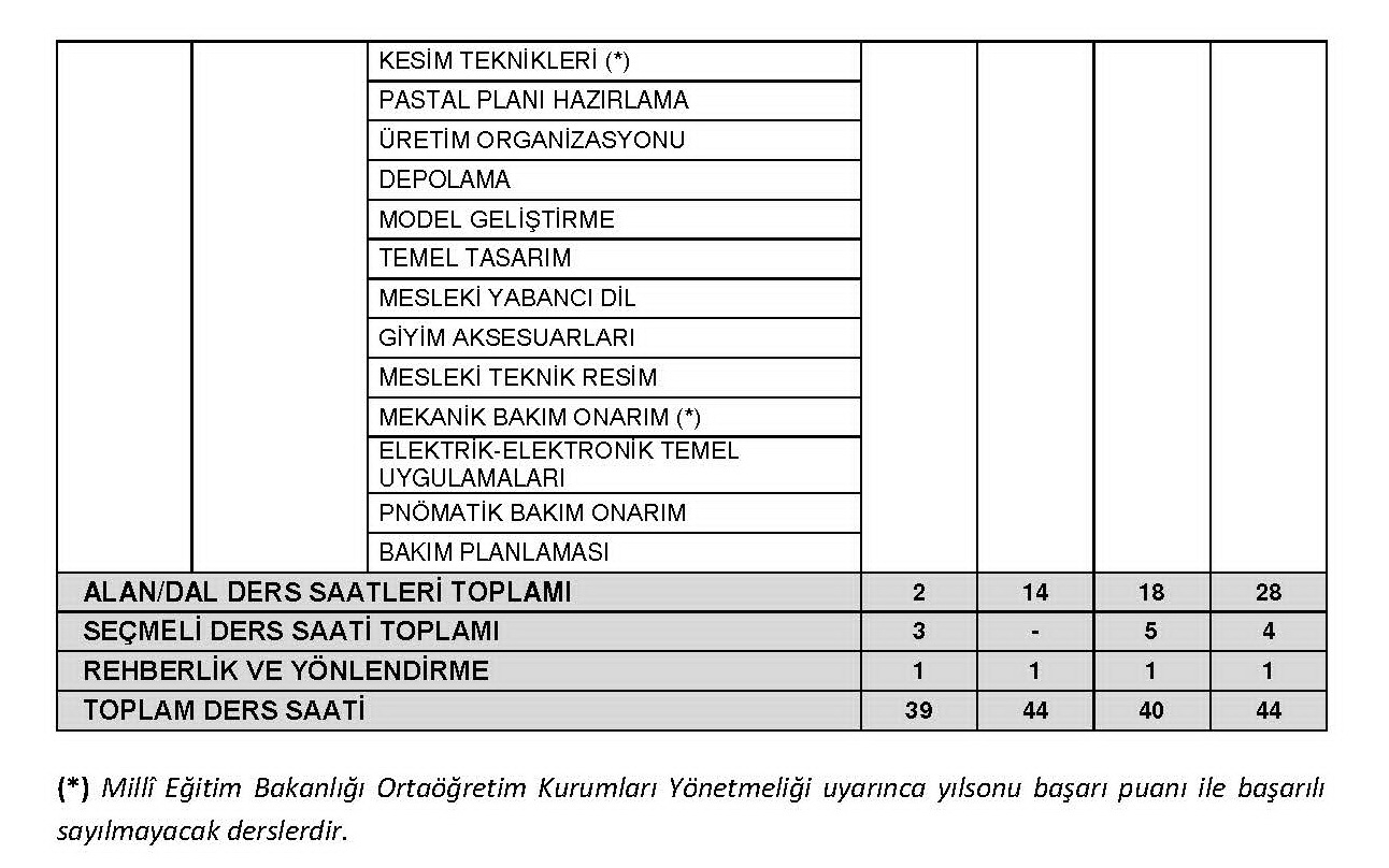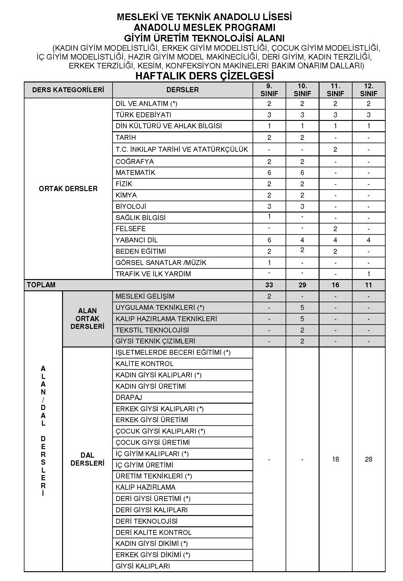 Mesleki Ve Teknik Anadolu Lisesi Anadolu Meslek Programı "Giyim Üretim Teknolojisi" Alanının Çerçeve Öğretim programında yer alan Haftalık Ders Çizelgesi aşağıda yer almaktadır.