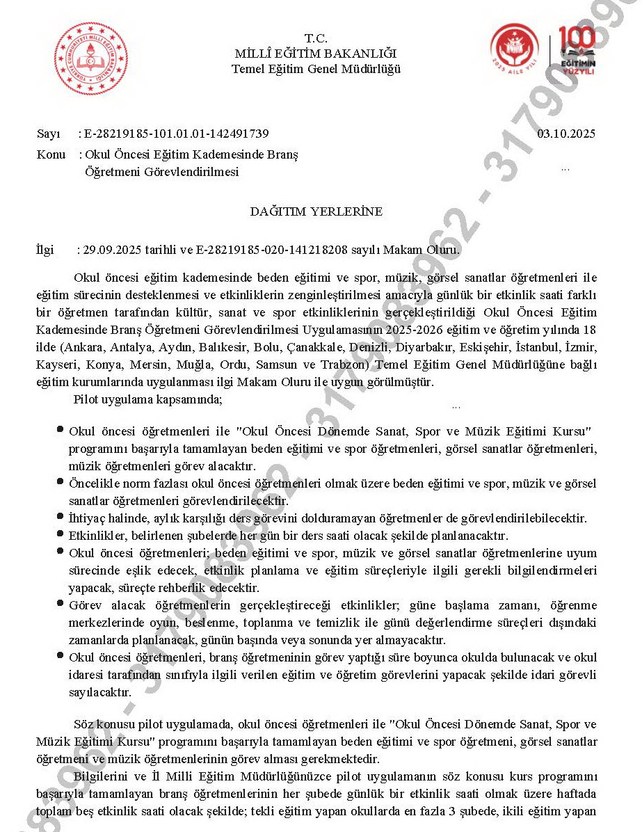 Okul öncesi eğitim kademesinde beden eğitimi ve spor, müzik, görsel sanatlar öğretmenleri ile eğitim sürecinin desteklenmesi ve etkinliklerin zenginleştirilmesi amacıyla günlük bir etkinlik saati farklı bir öğretmen tarafından kültür, sanat ve spor etkinliklerinin gerçekleştirildiği Okul Öncesi Eğitim Kademesinde Branş Öğretmeni Görevlendirilmesi Uygulamasının 2025-2026 eğitim ve öğretim yılında 18 ilde (Ankara, Antalya, Aydın, Balıkesir, Bolu, Çanakkale, Denizli, Diyarbakır, Eskişehir, İstanbul, İzmir, Kayseri, Konya, Mersin, Muğla, Ordu, Samsun ve Trabzon) Temel Eğitim Genel Müdürlüğüne bağlı eğitim kurumlarında uygulaması yapılacak.