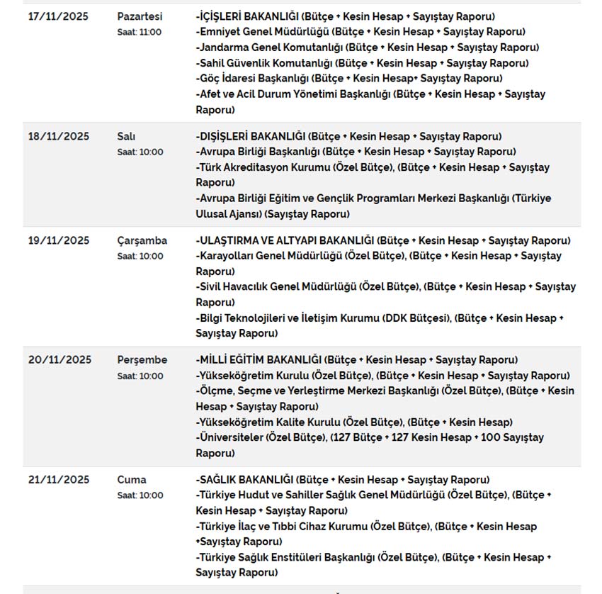 TBMM Plan ve Bütçe Komisyonunda, 17 Kasım Pazartesi günü İçişleri Bakanlığının, 18 Kasım Salı günü Ulaştırma ve Altyapı Bakanlığının, 19 Kasım Çarşamba günü Dışişleri Bakanlığının, 20 Kasım Perşembe günü Milli Eğitim Bakanlığının, 21 Kasım Cuma günü ise Sağlık Bakanlığının 2026 yılı bütçeleri görüşülecek.