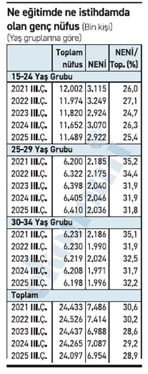 TÜİK'e göre 15-34 yaş arası nüfus üçüncü çeyrek itibarıyla 24,1 milyon kişi. Bu grubun yaklaşık yüzde 28,9'u, yani 6 milyon 954 bin genç, ne eğitimde ne de istihdamda bulunuyor. Son beş yılın aynı dönemine bakıldığında NENİ oranının yüzde 28,6 ile yüzde 30,6 arasında seyrettiği görülüyor. Ağırlıklı ortalama ise yüzde 29,5.