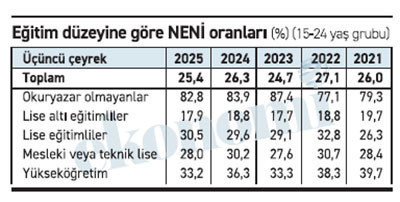 - 15-24 yaş: NENİ oranı yaklaşık yüzde 25