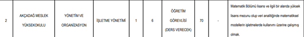 Malatya Turgut Özal Üniversitesi tarafından 19 Kasım 2025 tarihli Resmi Gazete'de yayımlanan Akçadağ Meslek Yüksekokulu Yönetim ve Organizasyon Bölümü İşletme Yönetimi Programı Öğretim Görevlisi kadrosunda "Matematik Bölümü lisans ve ilgili bir alanda yüksek lisans mezunu olup veri analitiğinde matematiksel modellerin işletmelerde kullanımı üzerine çalışmış olmak." şartı aranmaktadır.
