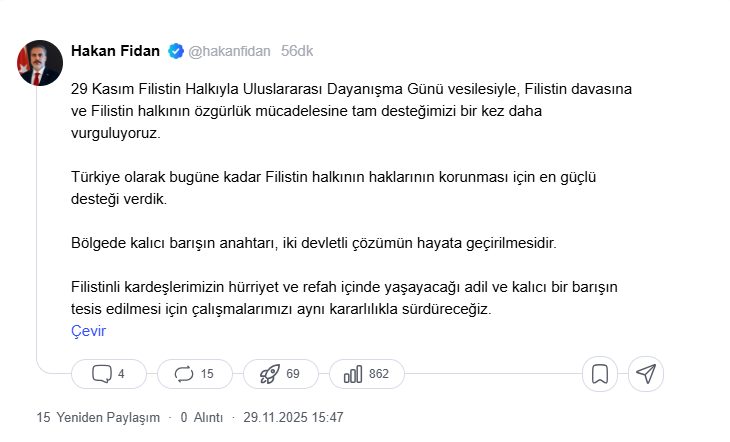 Dışişleri Bakanı Hakan Fidan, 29 Kasım Filistin Halkıyla Uluslararası Dayanışma Günü dolayısıyla yaptığı paylaşımda, "Filistinli kardeşlerimizin hürriyet ve refah içinde yaşayacağı adil ve kalıcı bir barışın tesis edilmesi için çalışmalarımızı aynı kararlılıkla sürdüreceğiz." dedi
