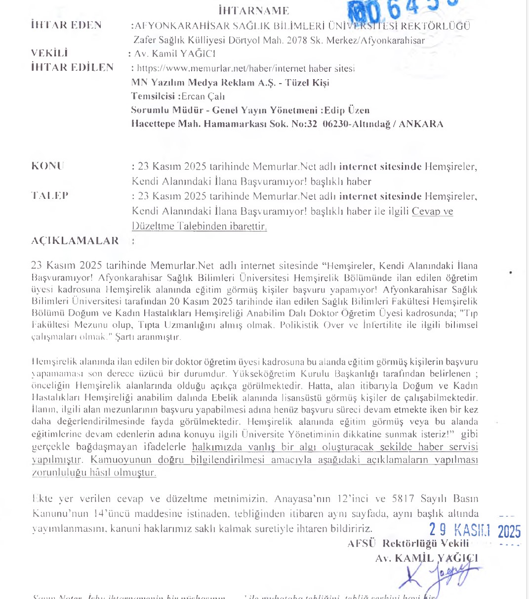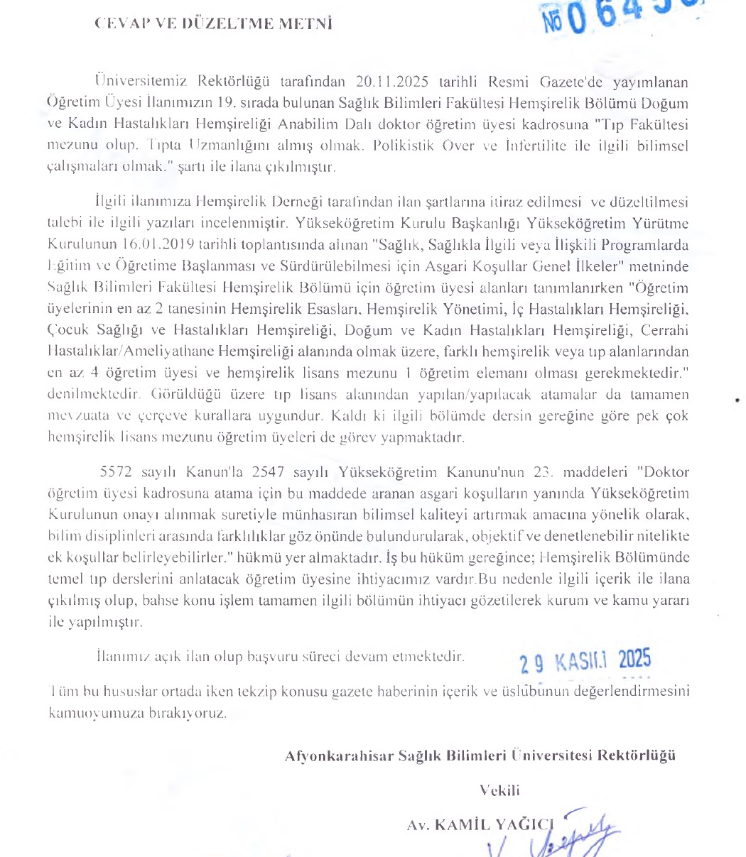 Afyonkarahisar Sağlık Bilimleri Üniversitesi, hemşireler kendi alanındaki ilana başvuramıyor haberine tekzip metni gönderdi.