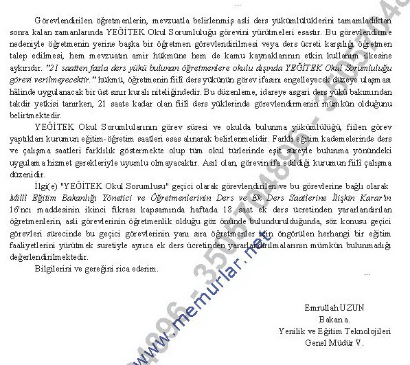 Ama YEGİTEK yürürlükteki tüm mevzuat hükümlerine ve Milli Eğitim Bakanlığı Yönetici ve Öğretmenlerinin Ders ve Ek Ders Saatlerine ilişkin Karar'ın "Ders görevinin yapılmış sayılacağı haller" başlıklı 16.maddesinin 2.fıkrası hükümlerine aykırı olarak "YEĞİTEK Okul Sorumlusu" görevlendirmesi yaparken öğretmene hem dersine gireceksin hem de "YEĞİTEK Okul Sorumlusu" görevini yapacaksın demektedir.